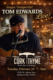 Tom Edwards is an Americana/Folk singer-songwriter and native Floridian who splits his time between North Georgia and the Jacksonville area. Known for "story songs" and playing guitar, mandolin, and banjo, he has produced multiple studio albums and performs solo as well as with his band, Gnarly Fingers. Tom will be performing at Cork Thyme Tuesdays until […]
